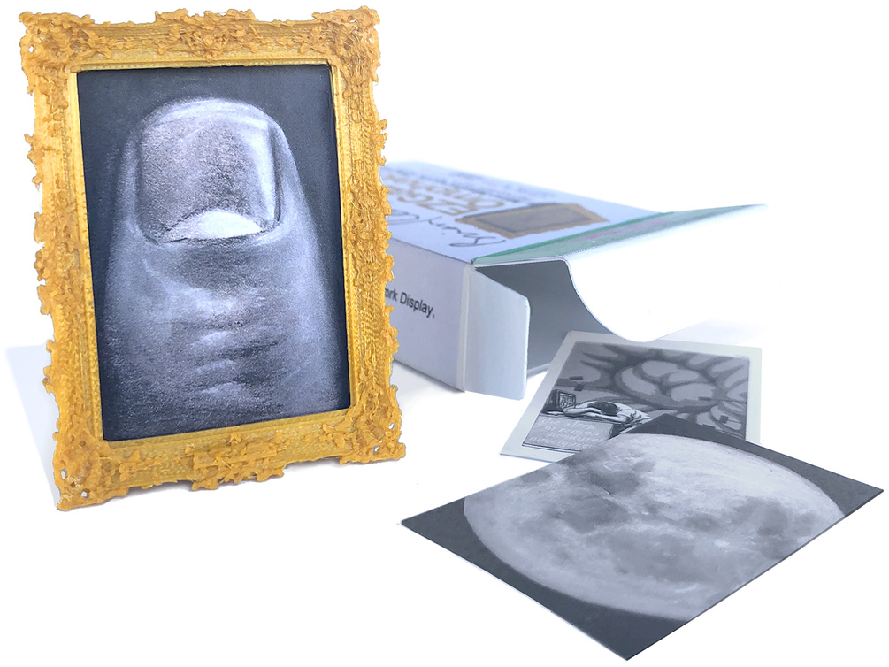 This pocket-sized 3D-printed frame comes loaded with an assortment of three printed renditions of drawings and paintings by the artist, which slide up to reveal the omphalos, or navel, for prolonged contemplation. Available in 10 colors.